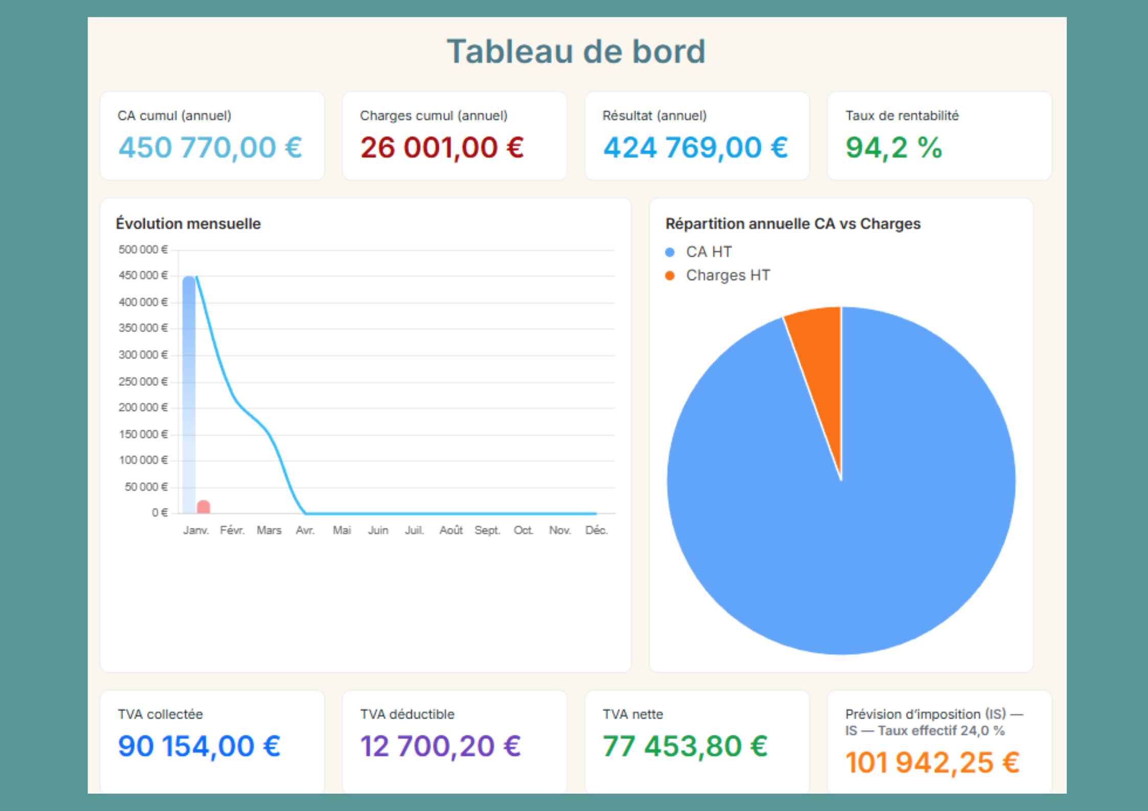 Aperçu : dashboard, factures, devis, charges et indicateurs.